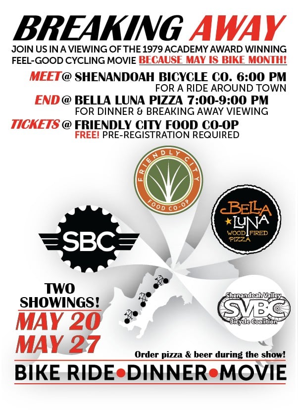 TICKETS @ Friendly City Food Co-op: The movie is FREE, but you must grab a ticket from the Friendly City Food Co-op to reserve a spot for dinner and the movie. Food and drink will be available for purchase during the movie from Bella Luna’s menu. Your reservation of a ticket enters you to win a $50 Gift Certificate from Shenandoah Bicycle Company! One winner will be chosen and announced at each Breaking Away viewing.