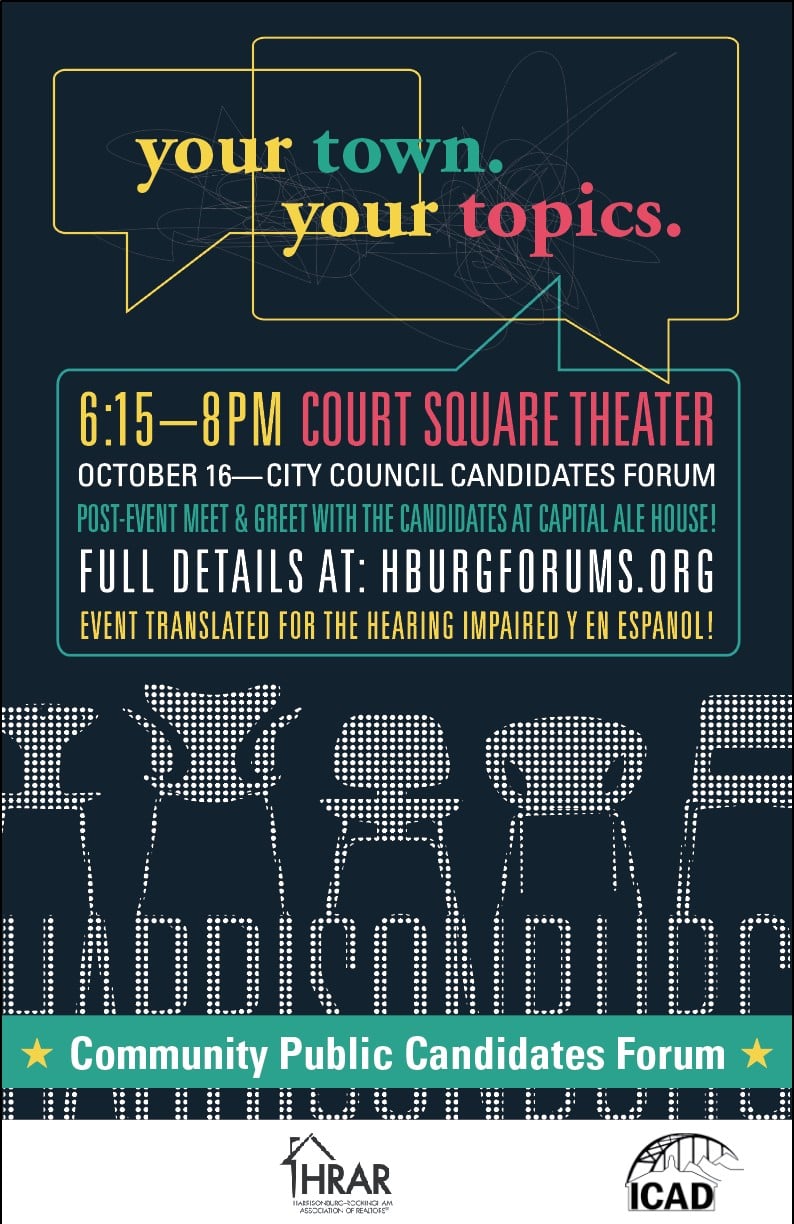 Youare invited to join candidates for Harrisonburg City Council on Tuesday, October 16 at Court Square Theater. The forum is organized by the Shenandoah Valley Bicycle Coalition, Harrisonburg-Rockingham Association of Realtors. The forum is free, open to the public and will start at 6:15 p.m.at Court Square Theater in the heart of downtown Harrisonburg.