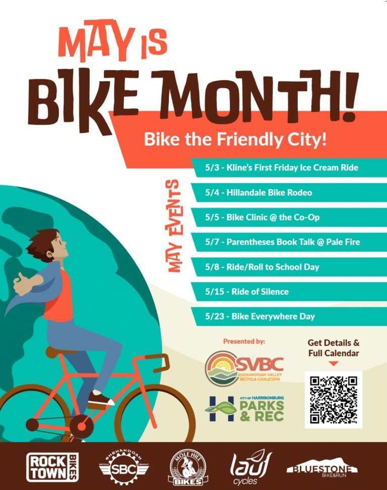 Harrisonburg City Parks and Recreation has teamed up with the Shenandoah Valley Bicycle Coalition to present you with various activities to celebrate Bike Month. All events are free, and are open to all.