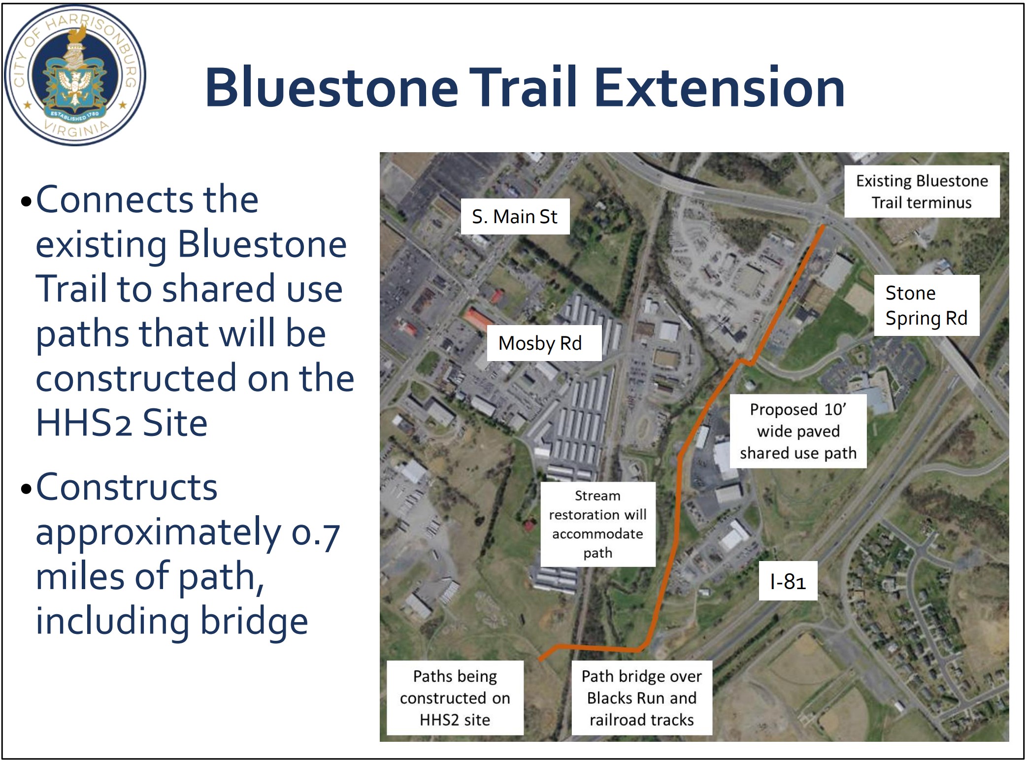 - Extending the Bluestone Trail would do more than connect to the High School; it would continue a north-south greenway connection to connect to Massanutten Technical Center, Rockingham High School, Pleasant Valley Elementary, and eventually south into Rockingham County to Mount Crawford and Bridgewater.
