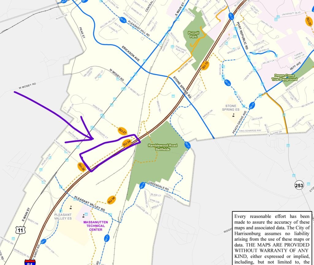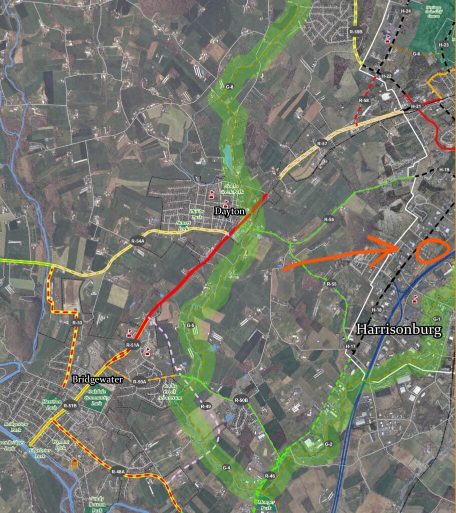 Harrisonburg’s Bicycle and Pedestrian Plan called for a greenway connection through the Rocktown School location before the school was ever proposed for this location along I-81