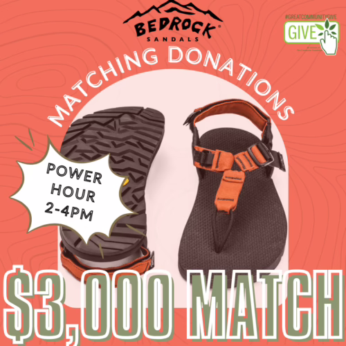 The second of our power hours will be from 2 to 4 p.m., when you get another chance to double your donation! This time, Bedrock Sandals will match $3,000, and Cognative MTB will match $1,000! We get a second chance to compete for bonus prize money from The Community Foundation. The more donors who give during that hour, the better our shot at winning extra funds for trails, safe streets, and people-first places!
