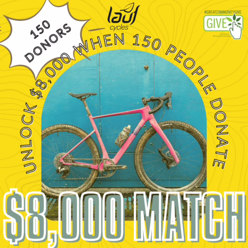 Thanks to Lauf Cycles, once we hit 150 donations, the Coalition will receive an additional $8,000 during the Great Community Give! Your donation, combined with the additional $8,000, goes right into our region – expanding trails, improving walking and biking, and creating a livable community that we cherish.